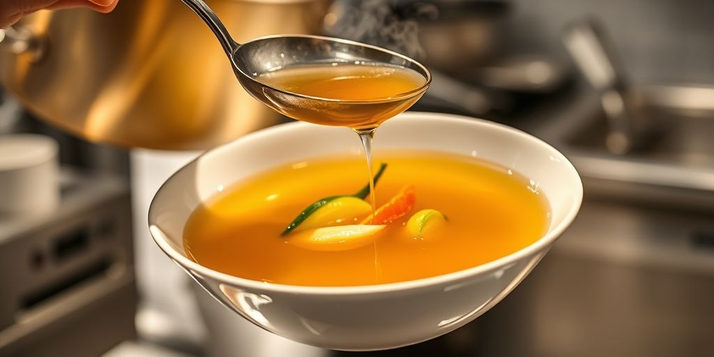 Сложность кроется в процессе осветления. Для этого используется так называемый "белковый плот" (или "осветляющая заправка") из яичных белков, мясного фарша и измельченных овощей. Эту смесь добавляют в холодный бульон и очень медленно нагревают. Белки коагулируют, захватывая все мельчайшие частицы, которые делают бульон мутным, и всплывают на поверхность, образуя плотную "шапку". Весь процесс требует постоянного контроля температуры и невероятной аккуратности, чтобы не нарушить этот хрупкий "фильтр". В результате получается идеальная, золотистая жидкость с концентрированным вкусом — настоящая душа бульона.