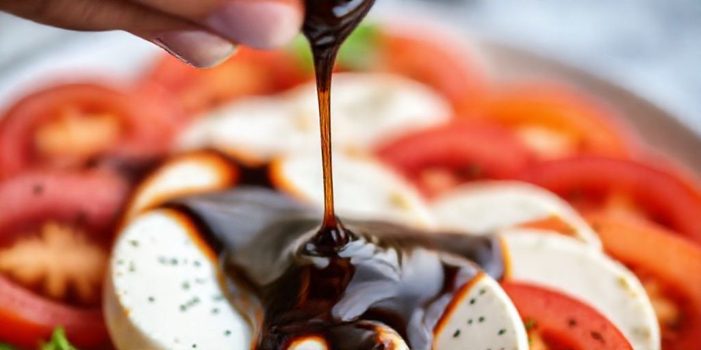 - Бальзамический крем (глазурь). Густой и сладкий бальзамический крем отлично дополняет вкус салата. Полейте им блюдо тонкими полосками перед подачей. Важно использовать именно крем, а не жидкий уксус, чтобы не нарушить баланс вкусов.