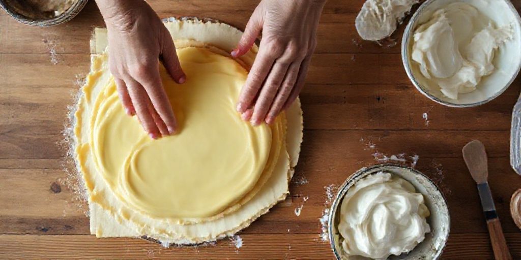 - Сборка торта. Возьмите плоское блюдо, на котором будете подавать десерт. Смажьте центр блюда ложкой крема, чтобы нижний корж не скользил. Положите первый корж и щедро смажьте его кремом (примерно 2-3 столовые ложки). Не бойтесь, если коржи ломаются — в готовом торте это будет незаметно. Повторяйте процедуру, укладывая коржи друг на друга и промазывая их кремом. Обязательно смажьте кремом верхний корж и бока торта.