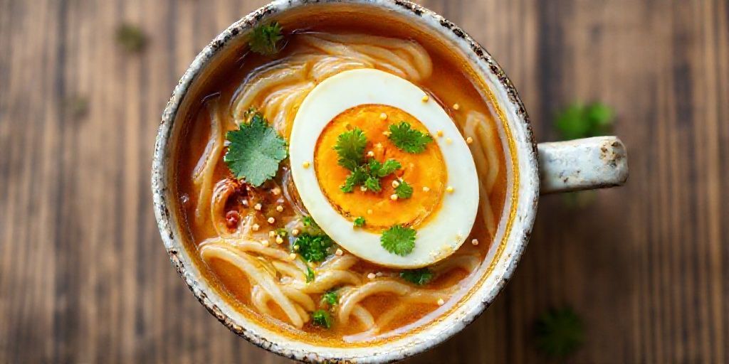 - Яичный вариант: После приготовления в микроволновке, пока суп еще очень горячий, быстро вбейте в него одно сырое яйцо и интенсивно перемешайте. Оно приготовится от жара бульона, сделав суп более густым и сытным, как рамен.