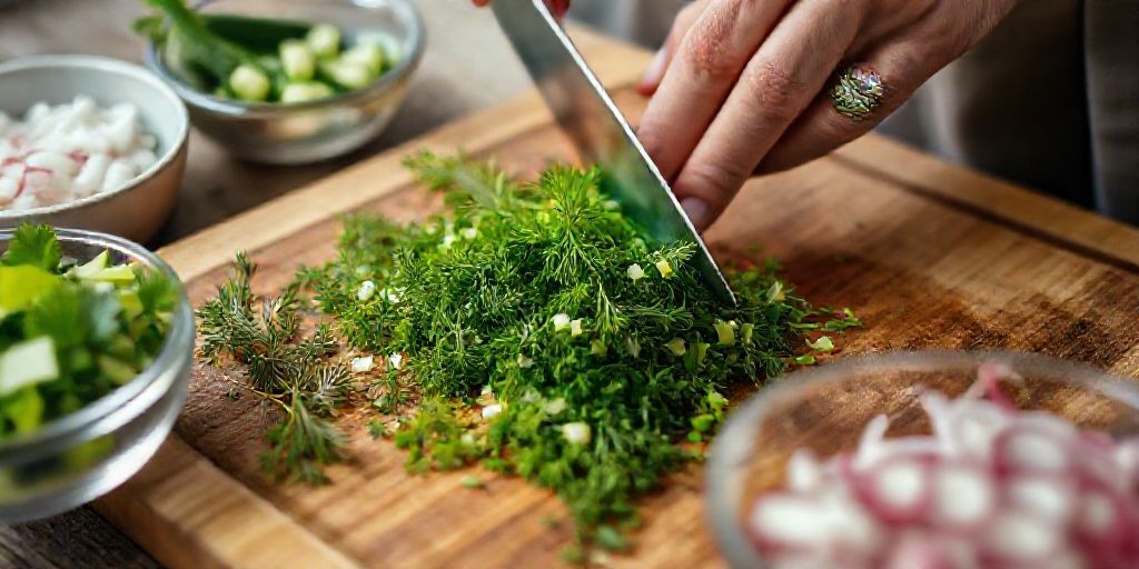 Шаг 2: Нарезка зелени Мелко нашинкуйте зеленый лук и укроп. Маленький секрет: чтобы зелень отдала максимум аромата, сложите нарезанный зеленый лук в большую миску, где будете смешивать окрошку, добавьте щепотку соли и слегка перетрите его ложкой или толкушкой до появления сока.