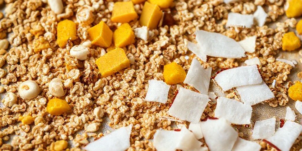 - Дополнение к базе: В качестве орехов используйте кешью. Вместе с овсянкой добавьте 1/2 стакана крупных кокосовых чипсов (не стружки). После того как гранола полностью остынет, вмешайте в неё 1/2 стакана сушёного манго, нарезанного кубиками. Кокосовое масло в этом рецепте будет особенно уместно.