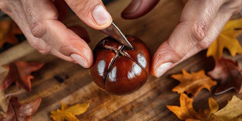 - Острым ножом сделайте крестообразный надрез на каждом каштане. Старайтесь прорезать скорлупу, но не сильно повредить само ядро.