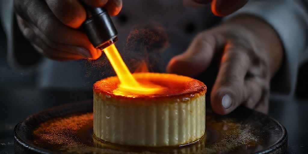 Идеальный инструмент для карамелизации — кулинарная газовая горелка. Держите пламя на расстоянии нескольких сантиметров от сахара и плавно водите им по поверхности, пока сахар не расплавится и не приобретет красивый янтарно-коричневый цвет.