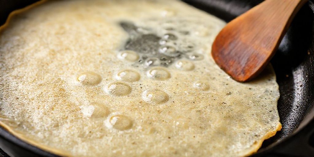 Выпекание. Хорошо разогрейте сковороду на среднем огне. Смажьте ее тонким слоем растительного масла с помощью кисточки или половинки картофеля. Наливайте тесто половником в центр сковороды и быстрыми круговыми движениями распределяйте его по всей поверхности.