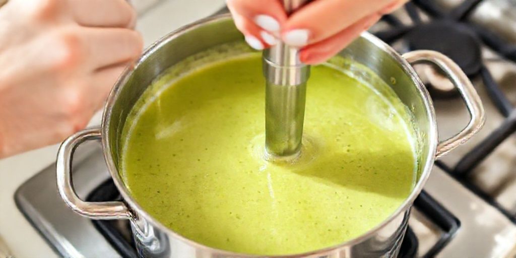 Шаг 4: Пюрирование Снимите кастрюлю с огня. С помощью погружного блендера пюрируйте суп до абсолютно гладкой, шелковистой консистенции. Если у вас нет погружного блендера, дайте супу немного остыть и взбейте его порциями в стационарном блендере.