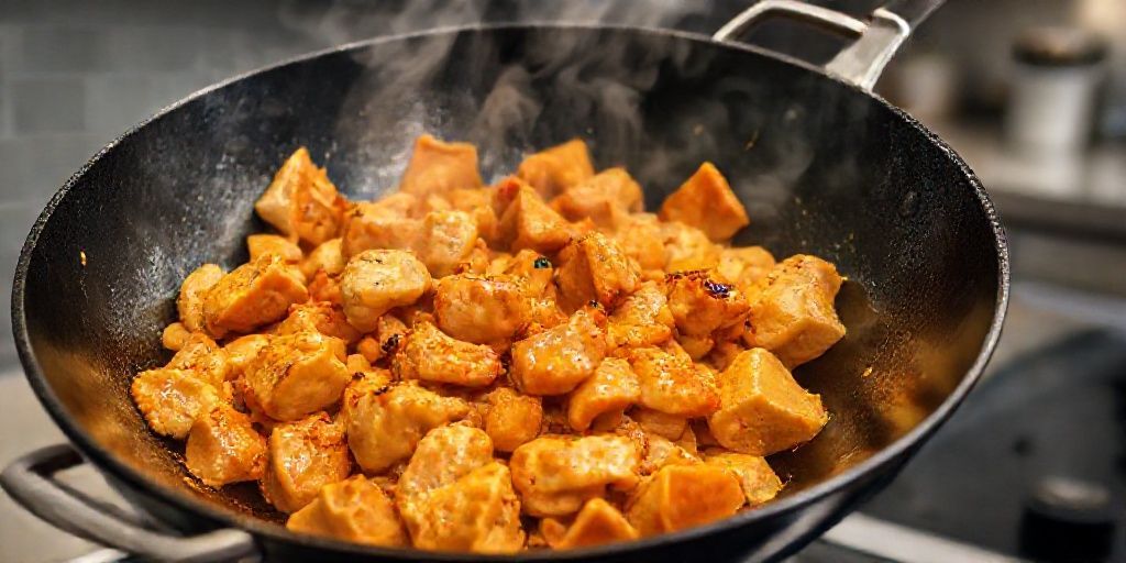 Шаг 4: Обжарка курицы Разогрейте большую сковороду или вок на среднем огне. Добавьте растительное масло. Выложите кусочки курицы в один слой (не перегружайте сковороду, лучше жарить в два захода) и обжаривайте до золотистой корочки со всех сторон, примерно 5-7 минут.